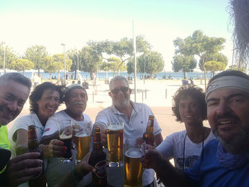 À nossa direita, mantém-se o paraíso de praias lindas de morrer e uma delas considerada uma das mais bonitas da Europa, Galapinhos. A Elsa acusa um pouco a distância e precisa de parar para comer. A Hortence caminha com calma, no seu passo certo, o António, recém-chegado de Santiago, vai cheio de ritmo. O Luís segue descontraído, mais a Idalina, a fazer-me companhia. Ainda paramos na Comenda para um reforço alimentar, já falta pouco. À entrada de Setúbal, o Vicente presenteia-nos com uma paragem técnica para bebermos umas cervejas tipo caneca que sabem que nem gingas. Muito rimos e conversamos de antigas caminhadas, do tempo em que uma caminhada de 40 quilómetros era coisa rara.